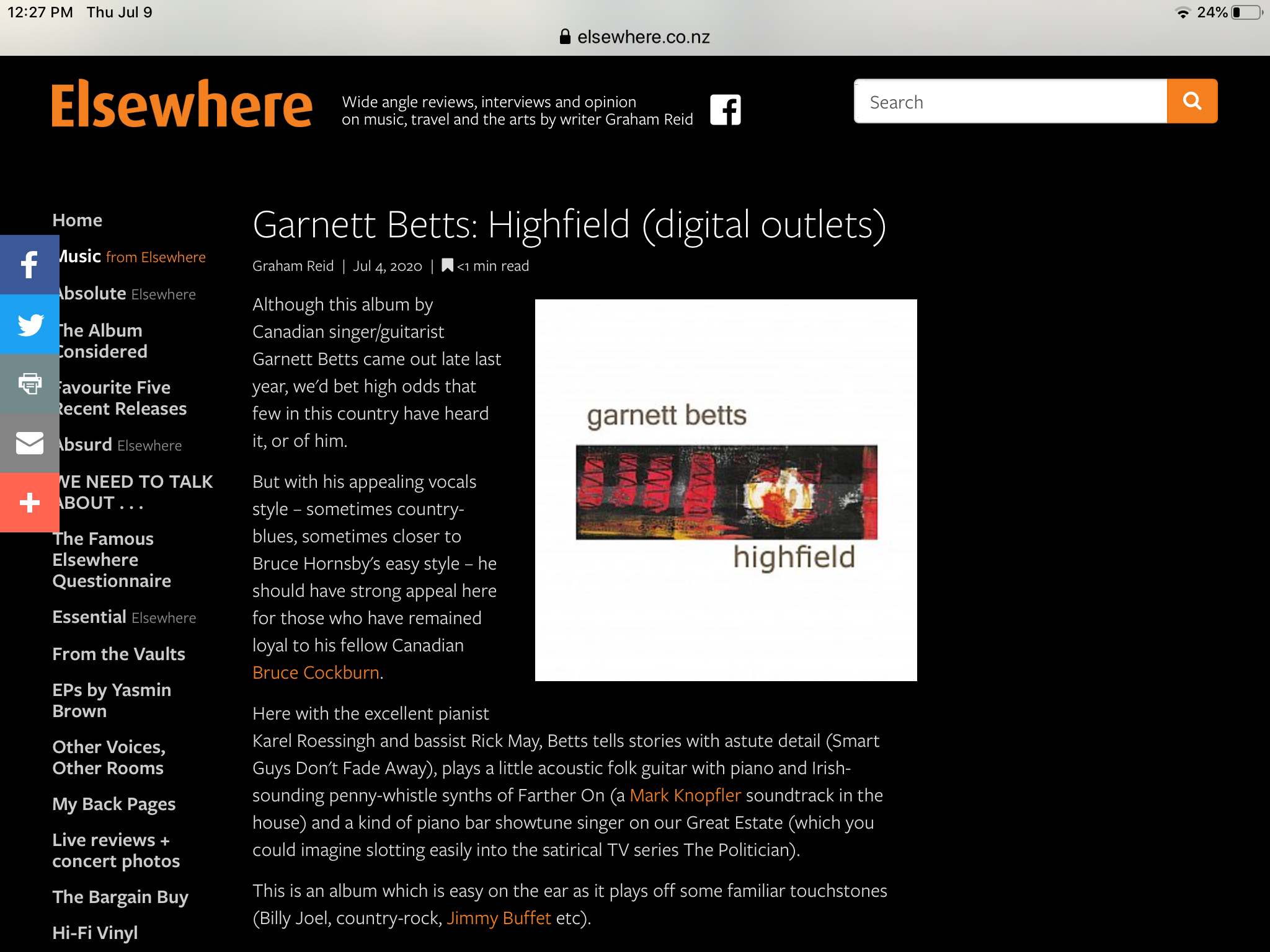 Album reviews, Folk musicalbum review, Garnett Betts, Highfield, singer songwriter